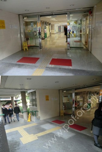 連接建築物室內部份及天井,出入口狹窄,設有單扇門,比天井高一級成障礙,無斜道輔助,無觸覺引路帶。