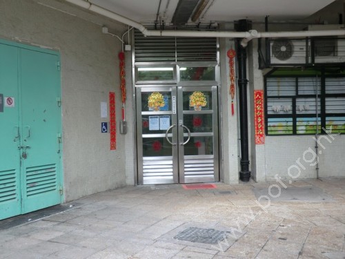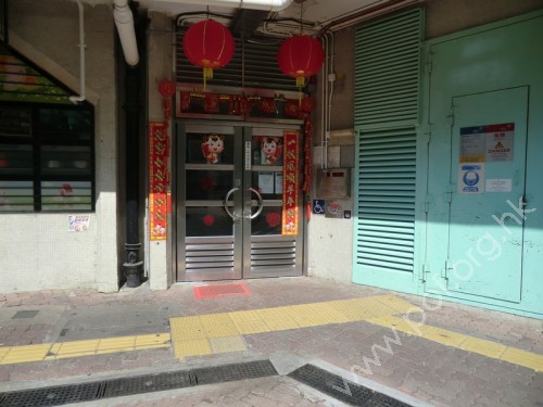 連接屋邨行人路,通道寬闊平坦無障礙,有國際暢通易達標誌,門是不銹鋼框玻璃對開推門,需輸入密碼開啟。門對出有黃色觸覺警告帶連同色觸覺引路帶,由其他大廈出入口及公共設施伸延至門前。