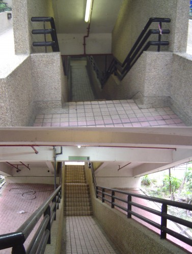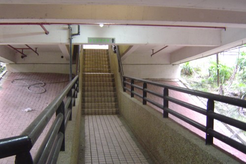 連接屋邨行人路,通道是梯級設計,旁無斜道輔助,無觸覺引路徑.