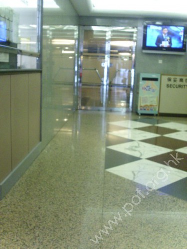 通道寬闊,入口有一級梯級,設有兩扇不銹鋼框玻璃推門,無觸覺引路帶。