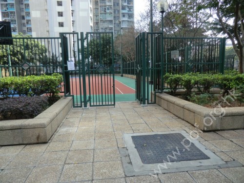 連接屋邨空地行人路,通道寬闊平坦無障礙,入口設有對開金屬閘門,外塗綠色油漆,單邊門的淨空間闊度足0.8米。無觸覺引路帶。