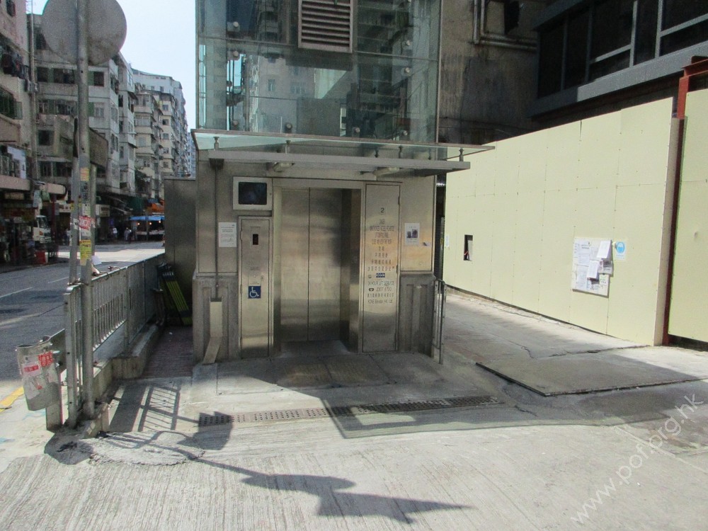 升降機位於梯級通道的背面,門前通道寬闊,但地面不平,而且附近有商鋪裝修,使地面更加難行走。無觸覺引路帶。