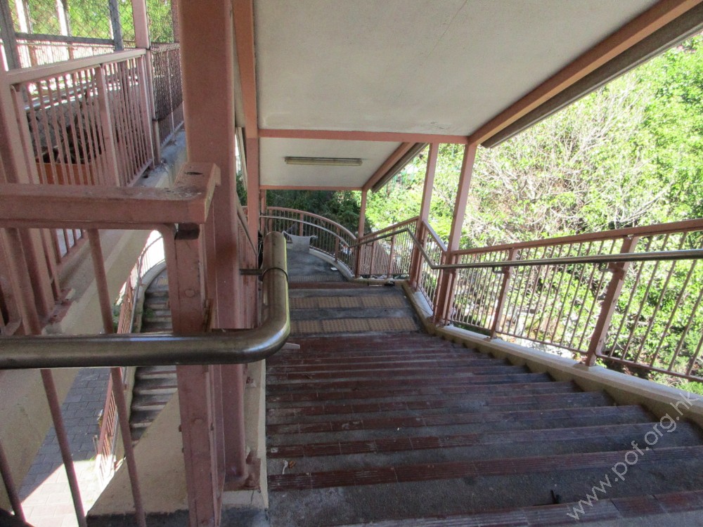 寬闊梯級通道,共有三段,每段各有15級梯級,兩旁設有扶手,無觸覺引路帶。