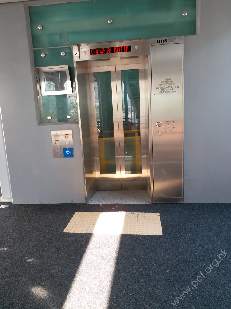 共有兩部無障礙升降機,入口地面鋪有觸覺警告帶,側邊有按鈕離地不超過1.2米,設有觸覺點字和凸字標誌,吊箱寬闊,三壁有扶手,設有低按鈕盤,開關有聲音提示,有三語廣播。