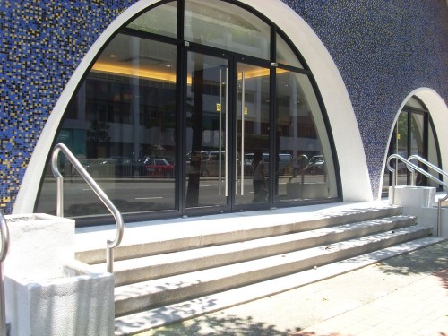 通道設有4級踏板的寛闊梯級,兩旁設有扶手,建築物入口設有手推玻璃門,無觸覺警告帶和引路帶。