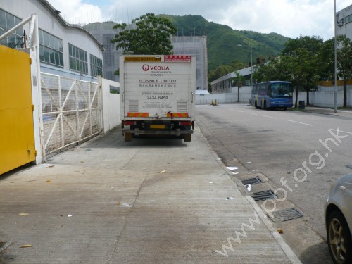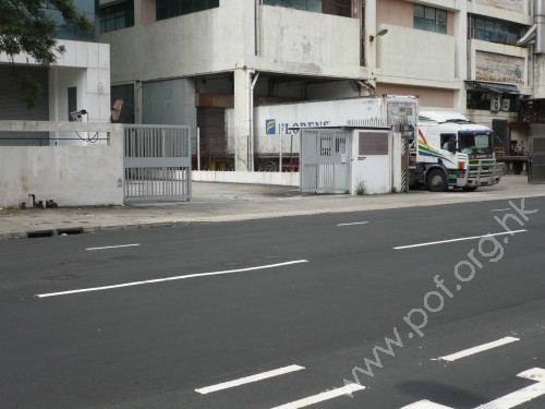 通道是寬闊平坦無障礙的車輛出入口閘門,前設下斜路緣連接汽車路,橫過汽車出入口的行人路無觸覺引路徑,閘門是灰色金屬框架對開大閘門.