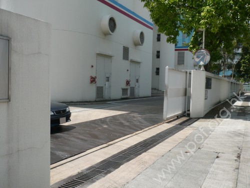 連接汽車路與旁行人路,通道是寬闊平坦無障礙的車輛出入口閘門,前設下斜路緣連接汽車路,橫過汽車出入口的行人路無觸覺引路徑,閘門是白色金屬框架大閘門.