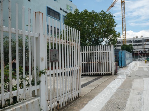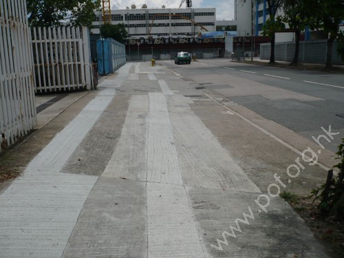 通道是寬闊平坦的車輛出入口閘門,前設下斜路緣連接汽車路,橫過汽車出入口的行人路無觸覺引路徑,閘門是白色金屬框架對開閘門.