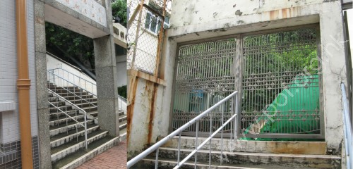 是寬闊梯級通道,共有四段,梯級頂端設有兩扇不銹鋼閘,無觸覺引路帶。