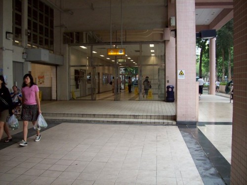 街市與市政大廈(圖書館等)入口共用,有兩級梯級.底部/頂部無觸覺警告帶.