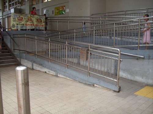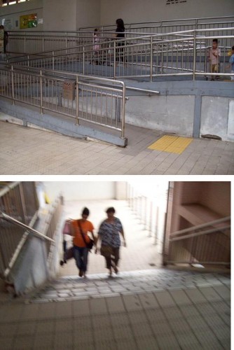 1段數級梯級,旁設迂回的長斜道輔助通行.梯級兩旁有扶手,底部/頂部有觸覺警告帶.斜道很長且迂回曲折,兩旁有欄杆及扶手,首尾有黃色觸覺警告帶.
