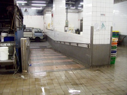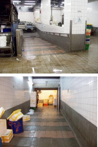 牆上有暢通易達標誌,通道尚算寬敞,但一邊放有雜物,地面較濕滑,與停車場接駁處是一條簡易斜道.