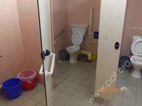 殘廁設有暢通易達標誌,男女廁均上鎖,如需使用需向職員取匙,廁所門上無扶手,無手柄,殘廁廁格門內扶手豎裝,召喚鐘按掣偏裏,馬桶,L扶手和摺合式扶手偏高。經本會投訴跟進後,建築署已全面改善有問題設施.。