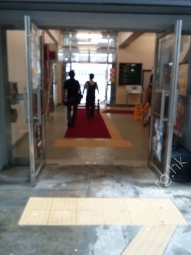 通道寬闊,門前有8級梯級,兩旁設有扶手,門口設有兩扇拉閘及兩扇玻璃推門,底頂有觸覺警告帶。