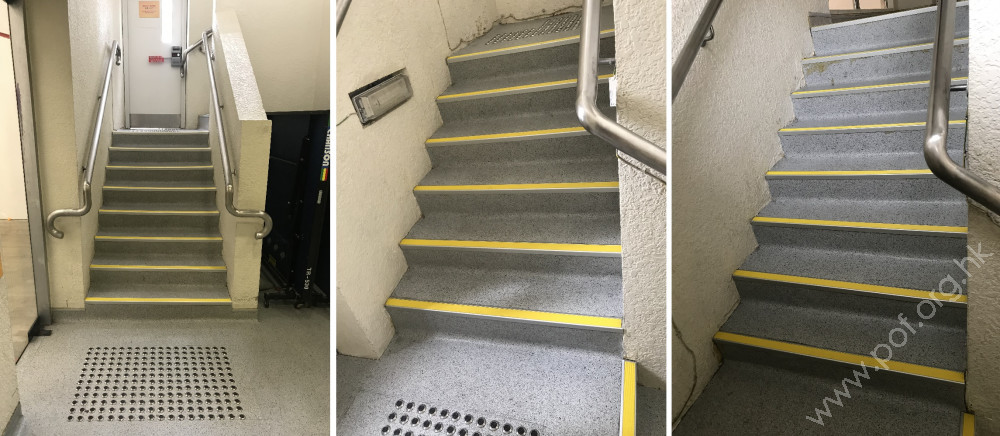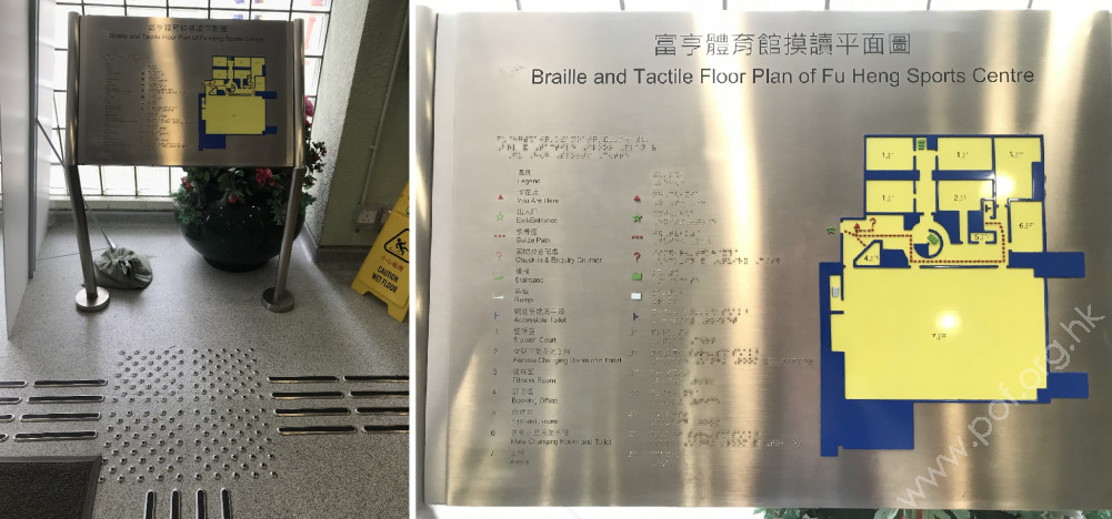 通道寬闊,入口前設有一條闊度大於1.05米的斜道,兩邊設有扶手,頂﹑底兩端設有觸覺警告帶。入口處設有一組兩扇對開的玻璃自動掩門,開啟後的淨闊度大於1.05米,玻璃門後地面鋪有觸覺警告帶。設有觸覺引路帶,由體育館的入口內引導至摸讀平面地圖﹑詢問及登記處﹑訂場處﹑主場﹑暢通達易洗手間及淋浴間前。