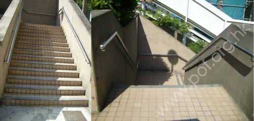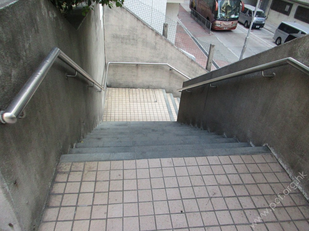 梯級共有四段,由底至頂分別有14、16、13、13級踏板,踏板闊度和豎板高度適中,兩旁設有扶手,底頂及平台均無觸覺警告帶。