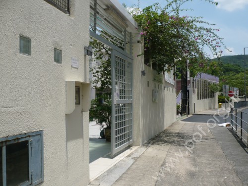 連接汽車路旁行人路,通道是寬闊平坦無障礙的學校出入口閘門,無觸覺引路徑,閘門灰色金屬框格子對開閘門.