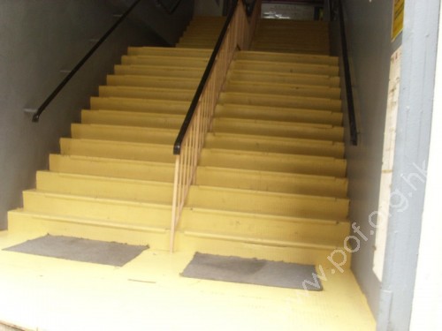 連接地面入口及大堂,共有兩段梯級,底段有13級及頂段有9級踏板,踏板高闊適中,兩旁及中間有扶手,底頂和平面無觸覺警告帶。