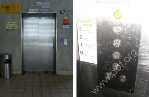 通道寬闊,平坦,入口設有前後兩道門,均設有兩扇紅色木門,可乘坐升降機到達這樓層,無觸覺引路帶。