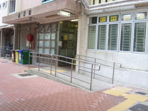 通道寬闊,門前一邊有兩級梯級,另一邊有斜道輔助,門口設有兩扇不銹鋼密碼閘,旁邊有密碼按鈕,有觸覺引路帶引至斜道底部。