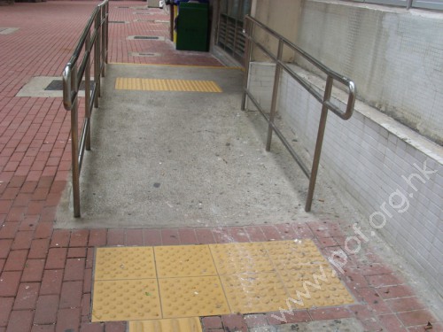 斜道闊足1.05米,斜度適中,兩旁設有不銹鋼欄杆式扶手,底頂均設有觸覺警告帶。