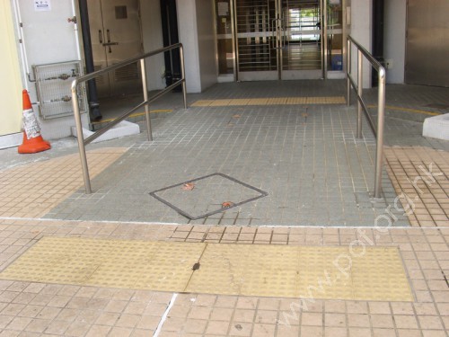 斜道寬闊,斜度低,兩邊設有不銹鋼欄杆式扶手,底頂均設有觸覺警告帶。
