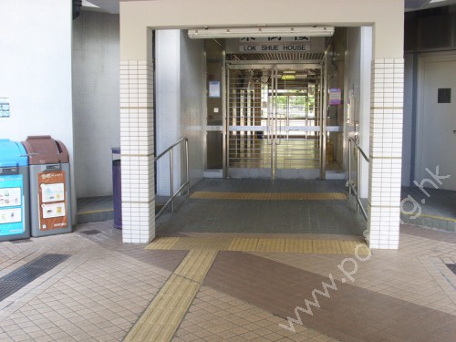 通道寬闊,門前是斜度適中的斜道,門口設有兩扇不銹鋼密碼閘,旁邊有密碼按鈕,有觸覺引路帶。