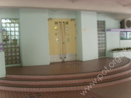 通道寬闊,入口前有3梯級,旁邊有斜道輔助,設有兩扇米黄色木門,無觸覺引路帶。
