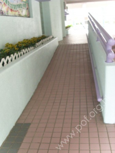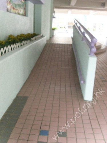 斜道闊足1.05米,斜度適中,只有單邊扶手,底頂有平面,但無觸覺警告帶。兩邊有矮牆,無凸出物.牆壁與地板形成明顯分野.
