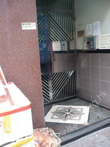 連接汽車路旁行人路,通道是寬闊的住宅正門閘門,有一級台階障礙,無斜道輔助,無觸覺引路徑,閘門是不銹鋼面框對開閘門.