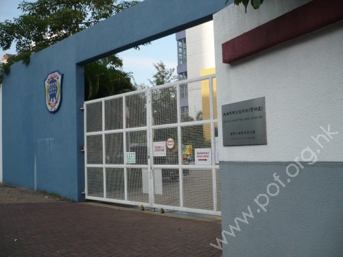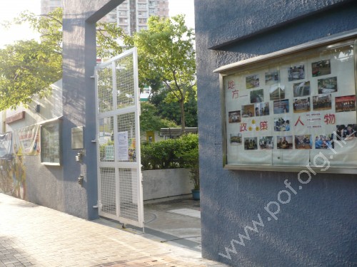 連接汽車路旁行人路,通道是寬闊平坦無障礙的學校出入口閘門,往來校園內學校建築物,無觸覺引路徑,閘門是白色金屬框鐵網對開閘門.