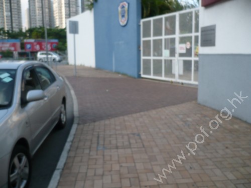 連接汽車路旁行人路,通道是寬闊的學校出入口閘門,往來校園內學校泳館,出入口內行人路低一級成障礙,無斜道輔助,無觸覺引路徑,閘門是白色金屬框鐵網閘門.