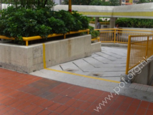 斜道闊足1.05米,共有兩段轉折,斜度適中,只有單邊扶手,底頂有平面,但無觸覺警告帶。