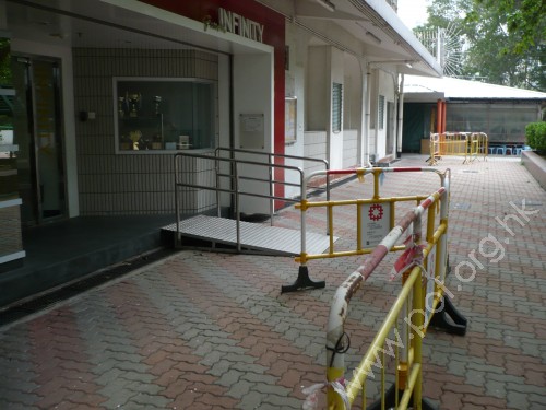 連接廣崇樓前屋邨行人路與青少年中心正門前台階高低位置,斜道是夠闊的金屬斜板,斜度一般,頂底兩端無觸覺警告帶,兩邊設有欄杆,兩邊欄杆旁無牆壁.
