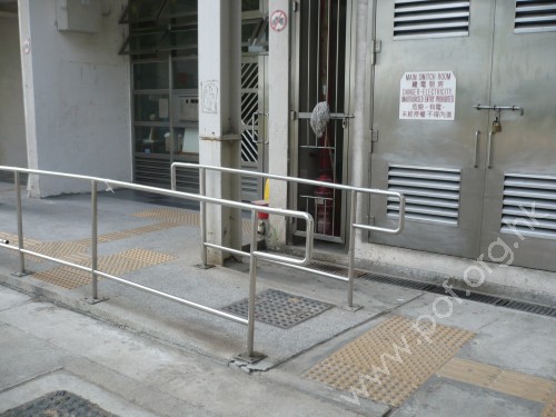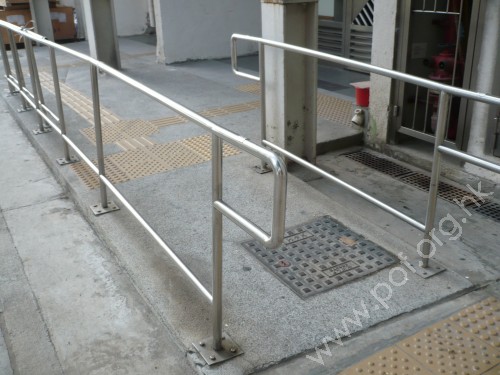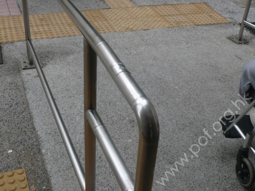是金屬色圓條形,兩邊成欄杆形固定在斜道兩邊上,頂底兩端有平行地面伸延設計,及有觸覺點字和凸字資料.