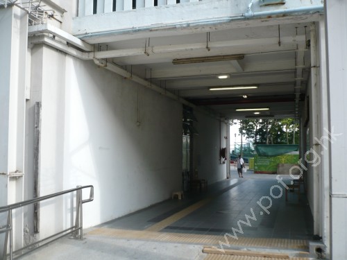 連接住宅地面正門旁橫向行人路,通道是寬闊平坦無障礙的住宅地面走廊出入口,連接穿過住宅地面的走廊通道,往來住宅與華信樓之間平台,出入口設有黃色觸覺引路徑,一端伸延轉向至住宅正門,另一端往住宅與華信樓之間平台伸延.