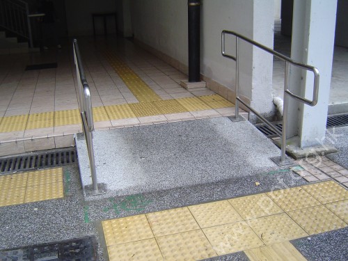 連接住宅地面正門閘門與前行人路高低位置,斜道寬闊,斜度低矮,頂底兩端設有黃色觸覺警告帶連位置磚,兩端均連接同色引路徑伸延,兩邊設有欄杆形扶手固定在斜道兩邊上,兩邊扶手旁無牆壁.