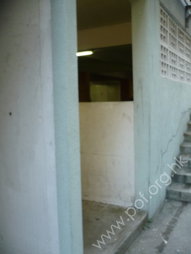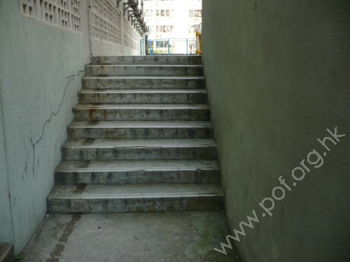 連接停車場與住宅之間行人路與行人出入口,共有九級梯級,頂底兩端無觸覺警告帶,兩邊無扶手,兩邊牆壁一邊淺綠色另一邊淺藍色無凸出物,踏板淺灰色.