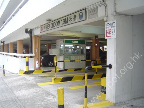 連接汽車斜路旁行人斜路,通道是寬闊的多層停車場行人出入口,連接梯級通道往來多層停車場,無設升降設施輔助,無觸覺引路徑.