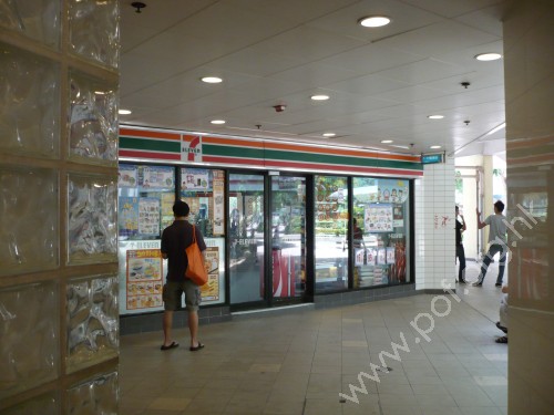 連接屋邨商場地面層行人路,通道是寬闊的店鋪正門,正門高出商場行人路一級成障礙,無設斜道輔助,無觸覺引路徑,門是深棕色金屬框玻璃自動門.