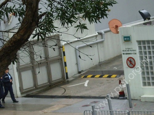 通道寬闊,設有兩扇不銹鋼閘,閘內分車輛入口及出口,各設有收放欄杆,無觸覺引路帶。