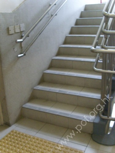 連接地下及樓上各樓層,每層設有兩段梯級10級梯級,踏板高闊適中,兩旁有扶手,底頂及平台有黃色觸覺警告帶。