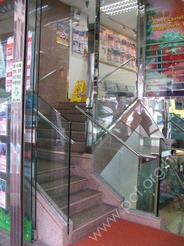 是一段9級踏板的往下的梯級,兩旁及中間設有管狀不銹鋼扶手,底頂均無觸覺警告帶。