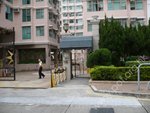 連接汽車路,通道是寬闊平坦無障礙的屋苑汽車出入口閘門,毗連屋苑行人出入口閘門,往來屋苑各座住宅樓宇,旁行人路無觸覺引路徑,閘門是黑色金屬花框對開大閘門.