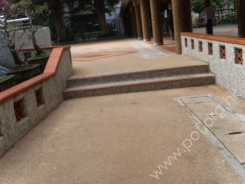 通道寬闊,由斜道及一段梯級組成,梯級只有兩級踏板,兩邊無扶手,底頂和平面無觸覺警告帶。無觸覺引路帶。