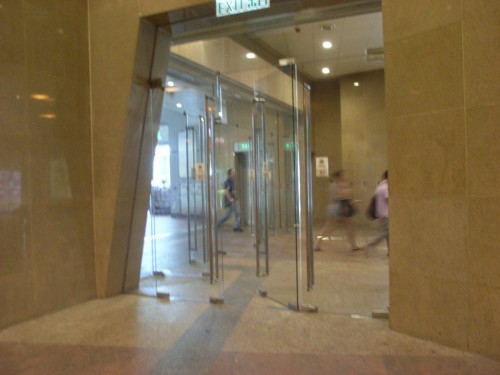 通道寬闊微斜無障礙,設有手推玻璃門,兩旁是玻璃幕牆及扶手,鋪有觸覺引路徑及警告帶.