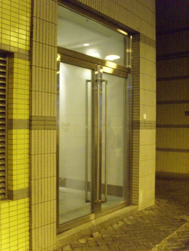 通道入口有一級梯級,設有兩扇手推玻璃門,無觸覺警告帶.