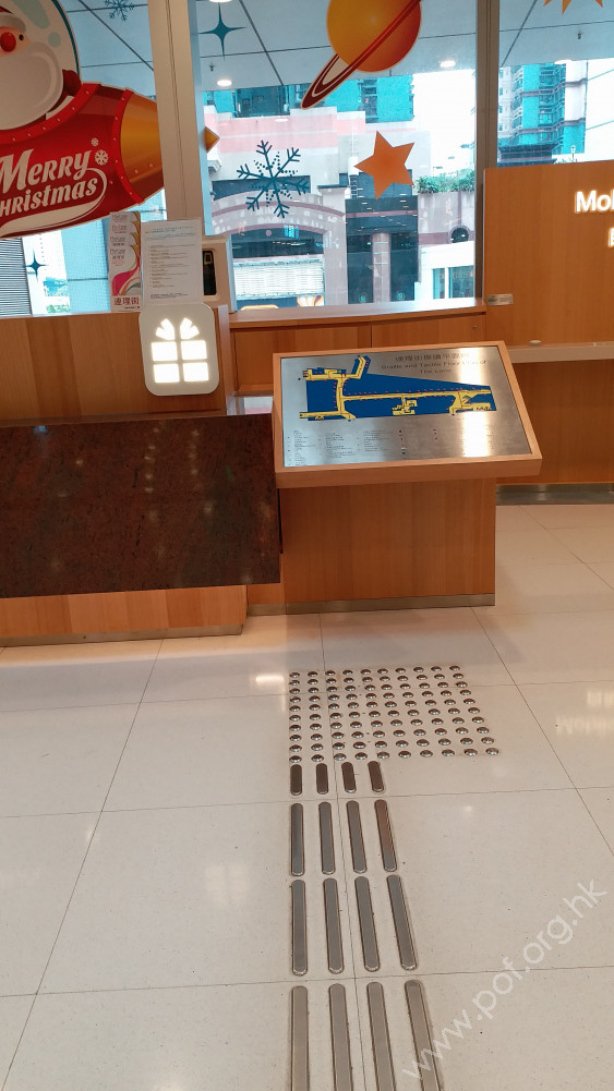 商場內各處都鋪有金屬製造的觸覺警告帶,導引至多個出入口,升降機,自動電梯,洗手間及詢問處等等.