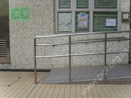 斜道闊足1.05米,斜度適中,兩旁有扶手,底頂有平面,但無觸覺警告帶。單邊有牆壁,牆上有密碼箱凸出.