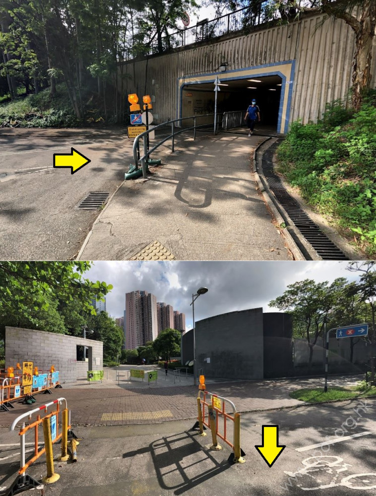 通道寬闊平坦,左邊是行人路,右邊是單車徑,在當眼處貼有前往「香港單車館」的方向指示牌;單車徑與行人路之間設有金屬欄杆分隔,行人路闊度大於1.05米,無觸覺引路帶。